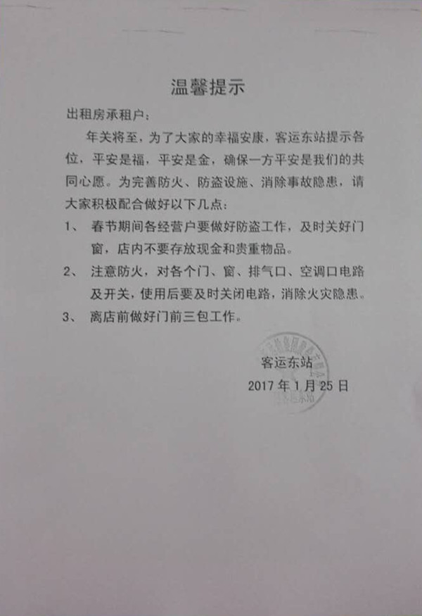 一行人對(duì)東站站場(chǎng)和出租房的消防設(shè)施、用火用電情況進(jìn)行了逐一檢查。要求工作人員加強(qiáng)安全防范,特別要注意春節(jié)期間的用火用電安全,下班后要及時(shí)切斷電源。并向周邊承租戶發(fā)出春節(jié)期間的溫馨提示,要求各承租戶在結(jié)束營(yíng)業(yè)后對(duì)店內(nèi)的用水、用電進(jìn)行仔細(xì)檢查,確保消除安全隱患,平平安安、快快樂樂的過(guò)春節(jié)。