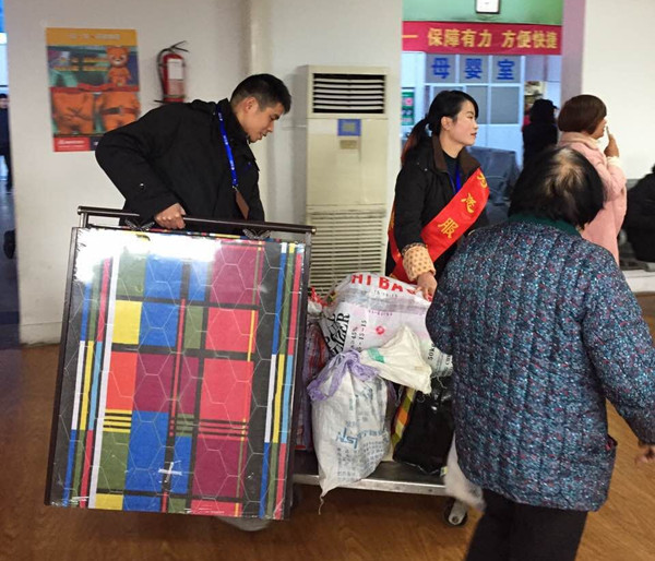 這時,業(yè)務(wù)站站長陳樂觀恰巧巡查到南大門,見狀立刻上前一把接過折疊椅說道:“趕緊放手,本來腰就不大好,回家還要帶小孩,萬一再出點閃失扭了腰,連小孩都抱不動就麻煩了?!币宦犑且粋€新媽媽,傍邊的大媽更是心疼了,“小姑娘,我不知道你還是新媽媽,來來來,趕緊把床給我”,說著就伸手去接床?!皼]事,沒事,再堅持一下就到了,你趕緊進(jìn)去,快開車了?!?br/> 劉虹在陳樂觀的幫助下,一路將行李送過了安檢口、檢票口,并安安穩(wěn)穩(wěn)的裝上了車??粗鴦⒑鐬樽约好η懊螅樌宪嚨拇髬屌R開車前,透過車窗感動地說,“謝謝!謝謝!要不是你們,我一個人這么多東西真不知道該怎么辦才好,你們真是大好人!”