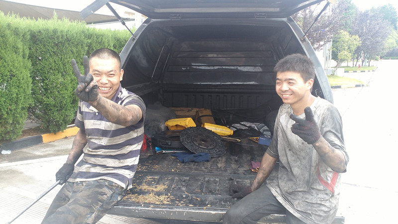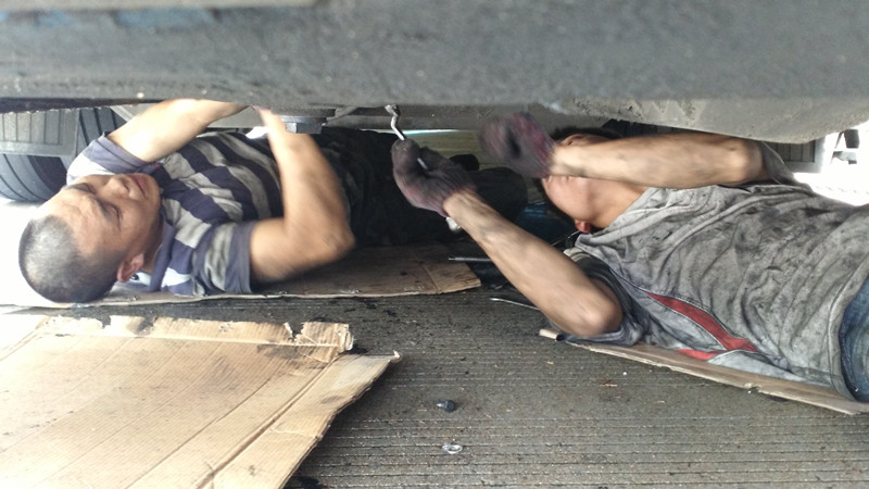 由于受臺風(fēng)影響,到達服務(wù)區(qū)時雖正值瓢潑大雨,但維修工陳永峰、李建波毫無怨言,立即投入到緊張的維修工作中去。由于受搶修場地的限制,他倆不能躺在木制躺板上進入低底盤的車底,只能在流淌著雨水的地上鋪上一塊紙板,趴在車廂底下工作,不一會兒他倆的衣服就濕透了,非常辛苦。時而烈日當(dāng)空,時而滂沱大雨的臺風(fēng)天,兩位維修師傅的衣服也是濕了干、干了濕,經(jīng)過努力,終于排除故障,完成搶修任務(wù)。