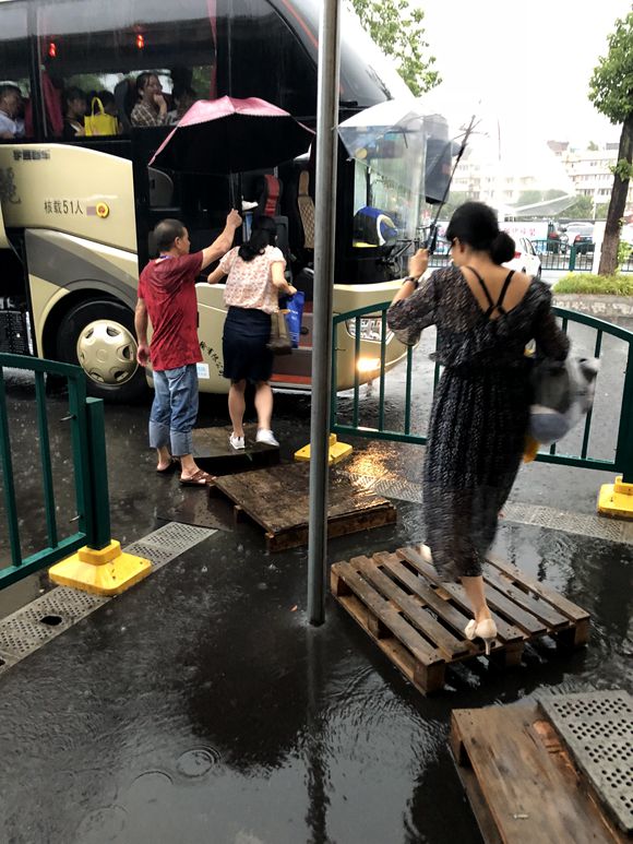 中秋佳節(jié)前夕,午后一場(chǎng)突如其來的滂沱大雨,地面積水一下子沒到了腳踝處,將麗水高鐵站的上車點(diǎn)堵住了。從高鐵下車轉(zhuǎn)乘客車的旅客上車成了一個(gè)大難題,幾位女乘客躍躍欲試,立刻又縮了回來。
