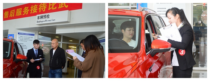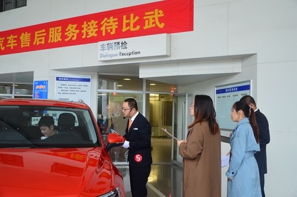 在下午進行的售后接待比武項目中,主要設置了禮迎客戶、環(huán)車檢查、唱檢車檢項目、車輛問診、簽訂委托書等環(huán)節(jié),考察選手對維修接待崗位工作技能的熟悉程度和解決實際問題的能力。選取服務接待的典型工作任務--常規(guī)保養(yǎng)接待,要求選手按照真實工作情境接待顧客并做好服務。