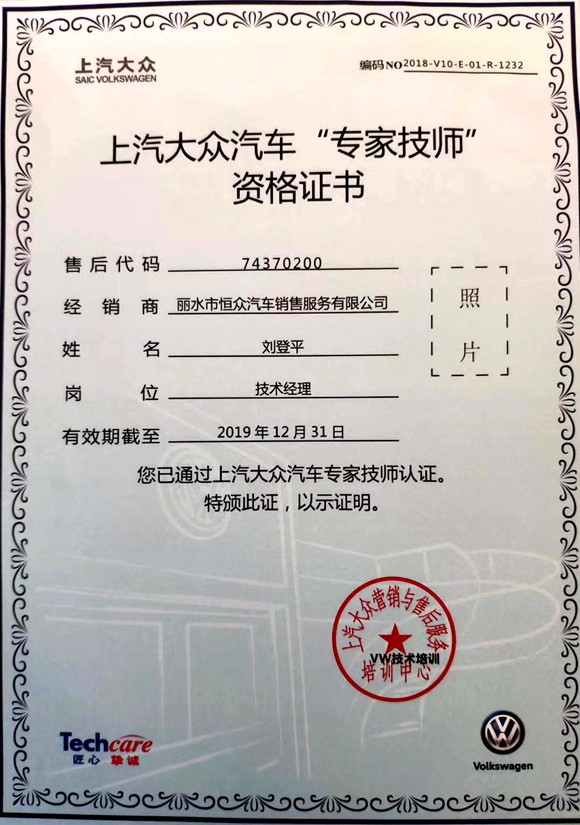 此次“專家技師”選拔賽在上海舉行,針對全國上汽大眾體系技術精英展開,麗水恒眾公司劉登平同志憑借自己在汽車行業(yè)16年的維修工作經驗,在為期3天的理論考試與實操中,給上汽大眾維修工程專家評委留下了深刻的印象,獲得此榮譽實至名歸。