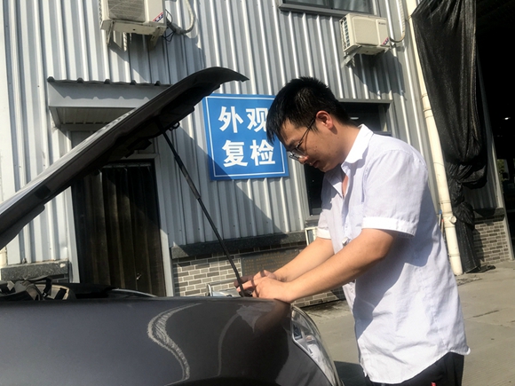 【外觀檢測員】當(dāng)他彎下腰檢測的那一刻,豆大的汗珠在他的額頭和臉頰上涌出,并沿著他的顴骨、鼻梁淌下?!傲胰障碌能嚿?,溫度通常在60℃以上,而越往車頭下方,溫度越高。可是再熱也不能讓車主多等?!彼f完這話,又接著復(fù)檢下一輛車。