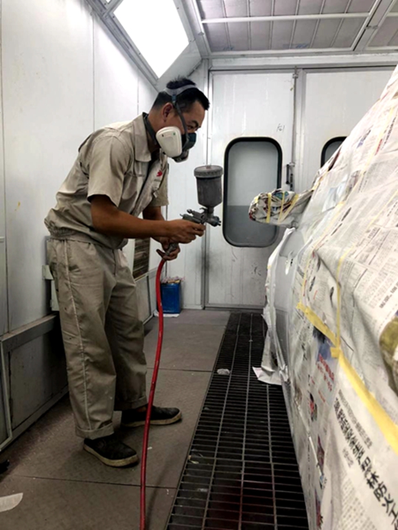 烤漆房的溫度極高,已經(jīng)接近45度,噴漆施工時(shí)必須關(guān)門窗戴上防毒面具,油漆師傅額頭上的布滿了密集的汗珠,上衣也已經(jīng)濕了大半。油漆的氣味,高溫的炙烤,這種感覺旁人是無法體會(huì)的。