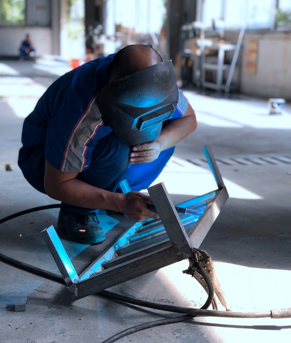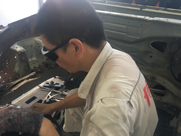 【鈑金工】這是鈑金師傅們,主要從事汽車局部的切割、焊接、整形,儼然是車輛的美容師。其實(shí)他們都是一個(gè)個(gè)皮膚粗糙,滿手老繭的“匠人”。走進(jìn)鈑金車間,師傅們正在進(jìn)行車輛局部的切割,隨之而來的便是吱吱呀呀…的噪音。師傅們絲毫沒有受其影響,為了防止切割時(shí)飛濺的火星燙傷,大家的頭上、腳上都穿戴上厚重的防護(hù)用品,把自己裹得嚴(yán)嚴(yán)實(shí)實(shí),還沒開始干活,就已是滿身汗水了。為了如期能交車,師傅們雖然熱的揮汗如雨,但沒有停下手中的工作,而是專業(yè)專注的完成每一個(gè)步驟。