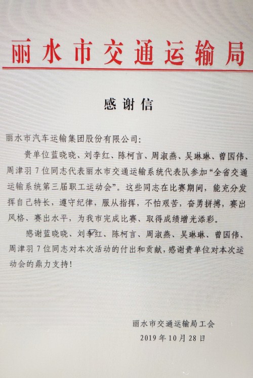 2019年10月24日,麗汽集團(tuán)藍(lán)曉曉、劉李紅、曾國偉等員工參加浙江省交通系統(tǒng)第三屆職工運(yùn)動(dòng)會(huì),本屆運(yùn)動(dòng)會(huì)麗水市交通局代表隊(duì)共派出28名運(yùn)動(dòng)員,其中麗汽運(yùn)動(dòng)員7名。