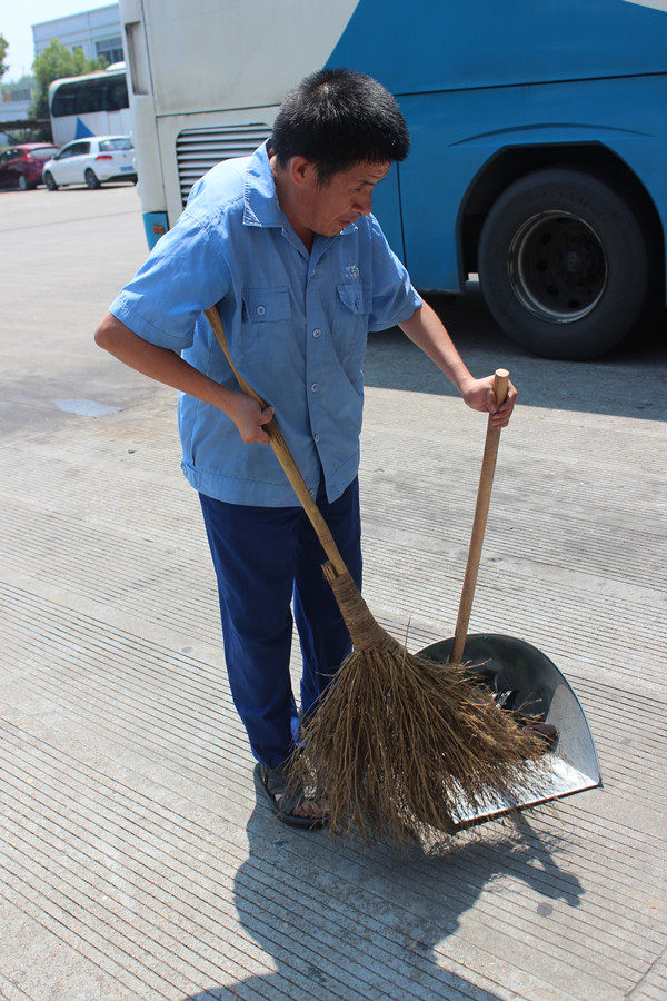 中午11:00時,保潔員宓建文一手拿著簸箕,一手拿著掃帚,冒著高溫酷暑,重復(fù)著低頭、彎腰的動作,堅持清掃站場垃圾。由于室外天氣酷熱,汗水順著他的額頭和臉頰留下。