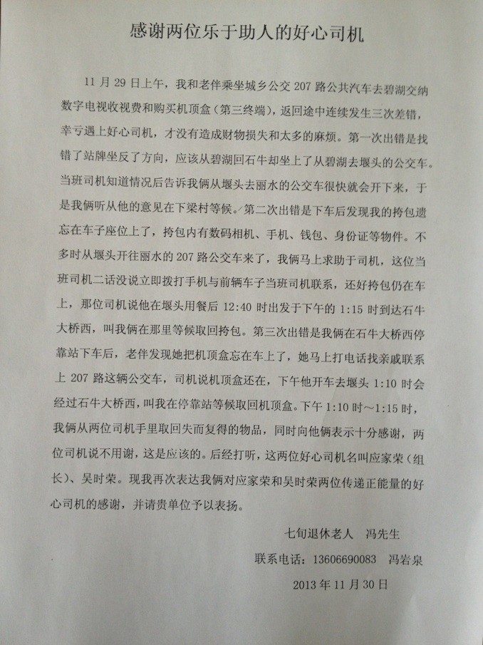 12月2日,一位七旬退休老人和他的老伴將承載著感激之情的感謝信送至城鄉(xiāng)公交經(jīng)理辦公室,緊握住領(lǐng)導(dǎo)的手,滿懷感激的說:“真是謝謝你們的公交司機(jī),如果沒有他們的熱心幫助,我今天損失可大了……,同時也感謝你們公交公司培養(yǎng)了這么一大批高素質(zhì)高水平的員工為市民服務(wù)?!?br/> 經(jīng)了解,11月29日上午,市民馮先生和他老伴乘坐207路公交車去碧湖繳納數(shù)字電視收視費和購買機(jī)頂盒,在往返途中連續(xù)發(fā)生三次差錯,幸好遇上好心司機(jī),才沒有造成財物損失和太多的麻煩。第一次出錯是找錯了站牌坐反方向。兩位老人繳費和購買機(jī)頂盒后,應(yīng)該從碧湖回石牛,但卻坐上了碧湖去堰頭的公交車。當(dāng)班司機(jī)知道情況后,及時將車停靠,并詳細(xì)告訴老人從堰頭去麗水的公交車很快就會開來,告訴他們應(yīng)該哪里下車,于是兩位老人在下梁村等候。第二次出錯是下車后,馮巖泉發(fā)現(xiàn)下車地點對了,但挎包遺忘在車子座位上了,挎包內(nèi)有數(shù)碼照相機(jī)、手機(jī)、錢包、身份證等物件。沒多久從堰頭開往麗水的K207路公交車來了,馮巖泉馬上向司機(jī)求助,這位當(dāng)班司機(jī)立即撥手機(jī)與前輛當(dāng)班司機(jī)聯(lián)系,還好挎包仍在車上,司機(jī)說他在堰頭用餐后12點40分出發(fā),于下午的1點15分到達(dá)石牛大橋西,叫老人在那里等候取回挎包。第三次出錯是在石牛大橋西??空鞠萝嚭螅T巖泉老伴發(fā)現(xiàn)她把機(jī)頂盒忘在車上了。老人通過親戚打電話聯(lián)系上了他們剛才乘坐的公交車,司機(jī)說機(jī)頂盒還在,下午他開車去堰頭1點10分會經(jīng)過石牛大橋西,叫老人在??空镜群蛉』?。下午1點10分-15分,馮巖泉分別從兩位司機(jī)手里取回了失而復(fù)得的挎包和機(jī)頂盒,同時向他倆表示十分感謝,并再三詢問駕駛員姓名,想通過媒體進(jìn)行表揚一下。而這兩位司機(jī)都笑笑說:“這是件非常普通的事,誰遇到這種事都會這么做的”。