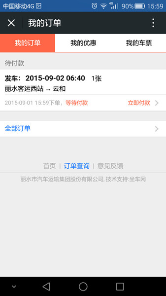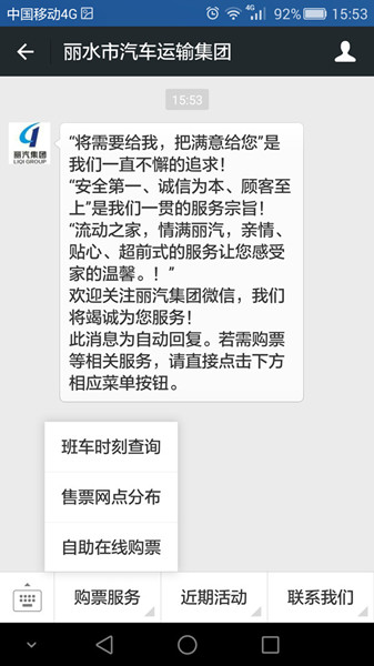假期將至,為滿足旅客多樣化的購票需求,現(xiàn)旅客只需關(guān)注“麗汽集團(tuán)”微信公眾號,就能實現(xiàn)通過手機(jī)終端直接購買從東、西汽車站始發(fā)班線的車票,還可以退票。
