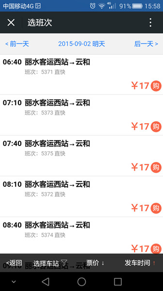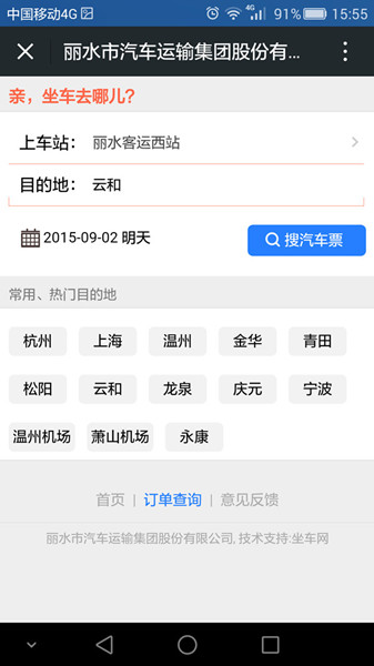 (3)點擊“購票”,進(jìn)入購買服務(wù)頁面,在上車站位置選擇“麗水客運(yùn)東站”或“麗水客運(yùn)西站”。