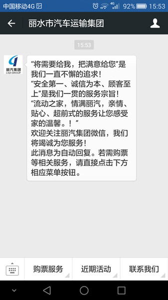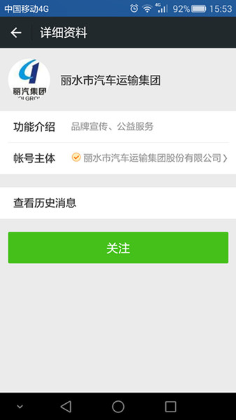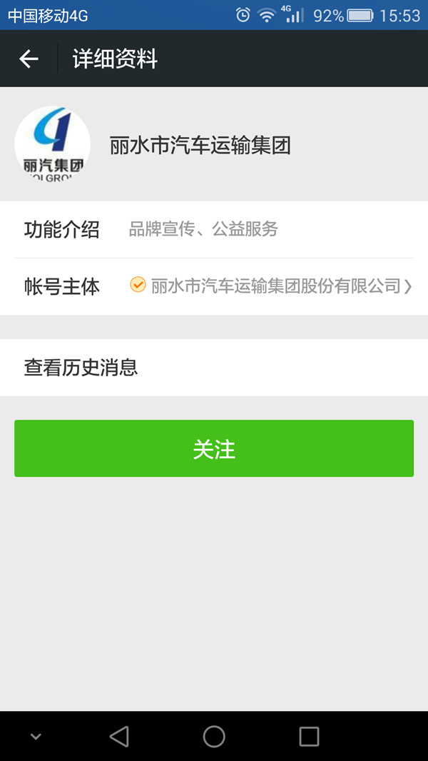 (1)打開微信,搜索添加“麗水市汽車運(yùn)輸集團(tuán)”微信公眾號或直接掃取二維碼,點擊關(guān)注。