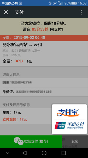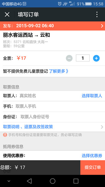 (4)點擊選擇需乘坐的班次,進(jìn)入填寫頁面,填寫取票人姓名、手機(jī)號碼及身份證。