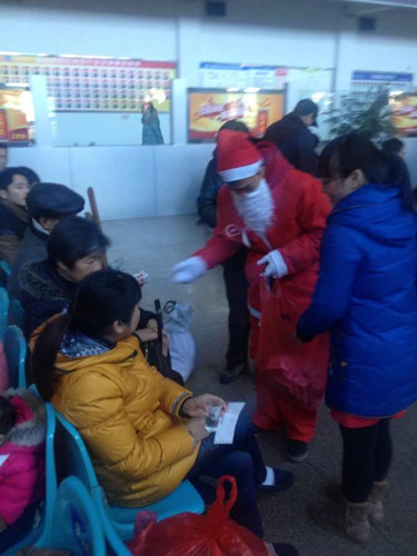 冬日的寒風(fēng)卻吹不走候車室里的溫暖,2013年的圣誕節(jié)期間,正當(dāng)旅客們?cè)诘群虬嘬嚨臅r(shí)候,客運(yùn)東站的三名“圣誕老人”現(xiàn)身候車室,在給旅客們送上一盒盒牛奶,旅客們感覺直呼驚喜。