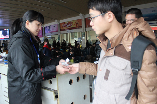 早已歸心似箭的旅客拎著大包小裹立刻在1號(hào)檢票口排起了長龍,趙妍不慌不忙的雙手接過旅客的車票看一眼票,然后刷票、撕下票根,一個(gè)、兩個(gè)、三個(gè)……一會(huì)兒的功夫,趙妍便完成了對(duì)幾十個(gè)旅客的檢票工作?!皬男睦砩蟻碚f,旅客等候檢票的時(shí)候都很著急,所以我們都會(huì)盡量檢得更快些?!壁w妍說,春運(yùn)期間,最多時(shí)一天將近要檢近一千五六百張票,撕票根都撕到手酸。