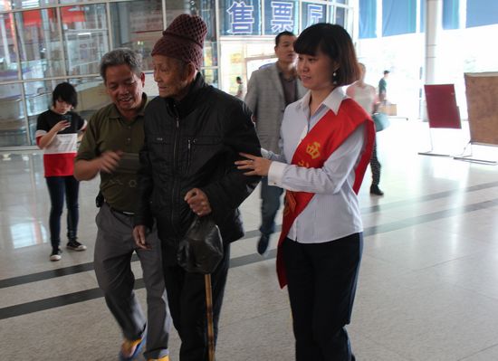 4月30日下午15:30時(shí)分,一位八十多歲的老人在五十多歲的兒子攙扶下,拄著拐杖顫顫悠悠的來到客運(yùn)西站,準(zhǔn)備乘車回慶元老家休養(yǎng)。服務(wù)班工作人員李愛秧眼捷手快,立刻迎上前幫扶。