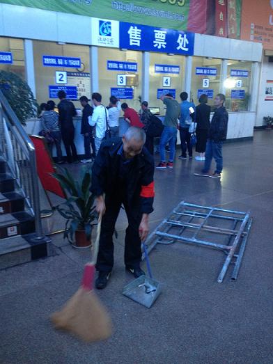 近段時期,客運東站正如火如荼的進行著創(chuàng)衛(wèi),各部門,各崗位都把創(chuàng)衛(wèi)當作頭等大事來抓,不敢有一絲的懈怡。我們的老同志也不甘人后,他時常在工作的間隙出現(xiàn)在候車大廳,一會兒撿個雜物、一會兒夾個煙頭、一會兒耐心的勸導旅客不要亂扔垃圾??矗‘斔l(fā)現(xiàn)候車室值班室因裝修留下了一些白色粉塵,就趕忙拿起掃帚,將這些死角清理干凈。他的干勁一點也不輸給那些剛參加工作沒幾年的小年輕。當我給他拍照時他還很不好意思的用背部躲閃著我的鏡頭。一邊還說著:“不要拍我!你去拍那些做的更好的同志”!