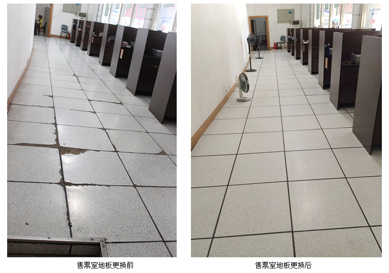 客運西站主樓一層售票室和消防監(jiān)控室的防靜電地板因使用多年,破損嚴重,影響了西站整體的美觀。為了保持西站良好的窗口形象和符合創(chuàng)建國家衛(wèi)生城市的要求,近日,西站對售票室和消防監(jiān)控室的防靜電地板進行更新。