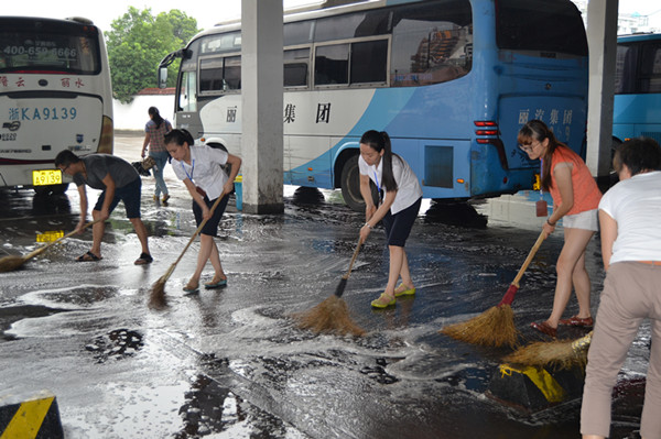 隨著全國文明城市創(chuàng)建工作地不斷深入,在東站“領(lǐng)導(dǎo)帶頭、全員參與”已經(jīng)成為習(xí)以為常的事情。在領(lǐng)導(dǎo)干部的帶動下,大家拿著水龍頭、掃帚、鏟子等工具,先后對幾個衛(wèi)生死角、發(fā)車棚、南大門進(jìn)口等地進(jìn)行了沖洗。經(jīng)過兩個小時的努力,東站的站容站貌煥然一新。