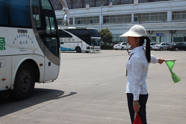 正午時分,行車員們頂著烈日,揮動著紅綠旗,認真地為車輛引航,安全及時地送出一撥撥旅客。愛美之心人皆有之,行車組的姐妹們也不例外,可是為了發(fā)車安全,一件長袖襯衫、一頂遮陽帽就是她們面對毒辣太陽的全副武裝。