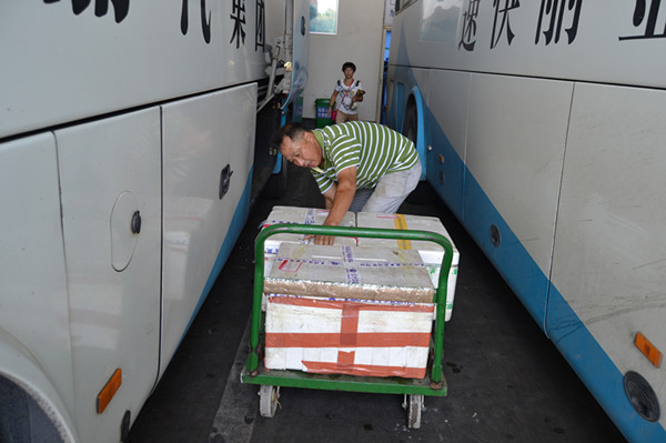 江永貴介紹,這還不是他們最苦最累的時(shí)候。如果班車集中到達(dá)或發(fā)班,裝卸行包就要“搶”時(shí)間,那才是最累的,忙得像打仗。 車次時(shí)間集中時(shí),經(jīng)常是這趟車還沒離去,另一趟車又進(jìn)站了。 我們裝卸工兩人一班,正常情況一天裝卸三四百件,多的時(shí)候裝卸過五百多件,最重的單件貨物有200多公斤。每趟班車裝卸完畢,最大的愿望就是猛喝水,但很快又成了汗流了出來,而好處就是省得上廁所?!苯蕾F調(diào)侃道。
