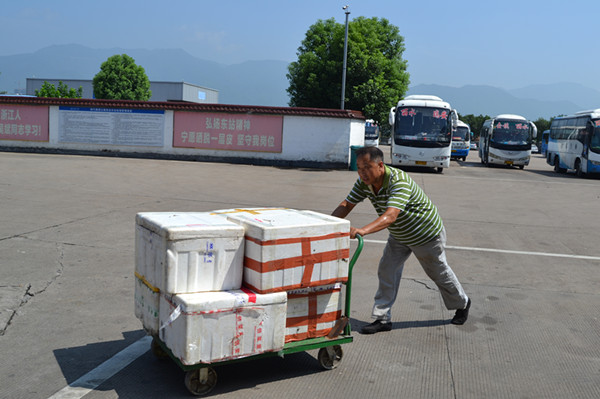 說話間,一輛班車緩緩駛?cè)胲囌?。在下客區(qū)等候的江永貴和同班的胡瑞華快速地打開車輛行李倉?!耙患?、兩件、三件、四件……”江永貴一邊念著數(shù)字一邊熟練地搬著貨物,一件件貨物在他們手上快速頻繁地拿起、放下。雖然揮汗如雨,但規(guī)范操作程序卻絲毫不受影響:仔細(xì)核對(duì)貨號(hào)、件數(shù)、 到達(dá)站點(diǎn)、駕駛員簽名…… ,對(duì)精密電子設(shè)備、易碎物品、海鮮等 ,他們總是不忘給予特殊的“關(guān)照”。這看似簡單機(jī)械,沒有技術(shù)含量的工作,卻需要莫大的毅力和耐心。車艙狹小,為適應(yīng)卸貨碼貨的需要,他們不停的變換姿勢,時(shí)而曲膝半蹲,時(shí)而探身彎腰,片刻,他們剛剛有點(diǎn)晾干的工作服又一次被汗水浸透了。