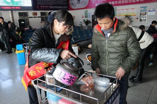 昨天進(jìn)入到大寒節(jié)氣,今天馬上就有一股冷空氣來應(yīng)景,氣溫有小幅的下降。一大早西站“流動(dòng)之家”服務(wù)班的崗員們就準(zhǔn)備好一大壺?zé)釟怛v騰的姜茶,免費(fèi)為候車大廳的旅客送上熱姜茶,幫助他們驅(qū)去寒意,溫暖回家的旅程。
