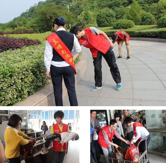 在西站候車大廳內(nèi)因?yàn)橛羞@樣一群身穿“紅馬甲”的志愿者變得格外溫馨。他們有的穿梭于人潮中,指引旅客在哪個(gè)檢票口檢票;有的為旅客送開水;有的引導(dǎo)旅客安檢、幫忙旅客提行李;有的帶著鉗子、塑料袋清撿站前廣場(chǎng)上的白色垃圾、清鏟地面口香糖;有的在候車室勸導(dǎo)不文明行為,例如吸煙、隨地亂丟垃圾等。在西站工作人員和志愿者的辛勤付出,讓繁忙的車站客流、車流秩序井然.