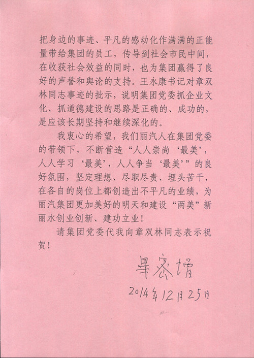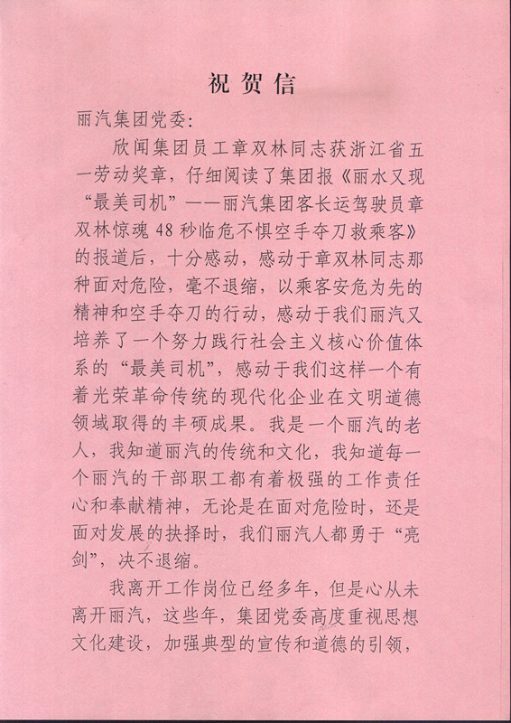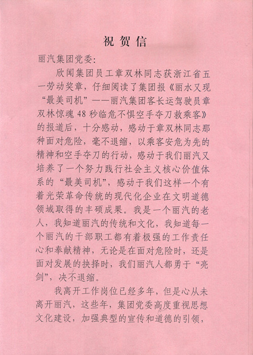 集團(tuán)公司客長(zhǎng)運(yùn)司機(jī)章雙林臨危不懼空手奪刀的先進(jìn)事跡,不僅受到全社會(huì)的高度關(guān)注,在感動(dòng)著社會(huì)、感動(dòng)著廣大員工的同時(shí),也感動(dòng)了離退休老同志。25日,集團(tuán)公司離休干部、年逾90高齡的畢密增同志專門發(fā)來(lái)賀信,高度肯定了集團(tuán)公司的思想文化建設(shè),也表達(dá)了對(duì)章雙林的祝賀。