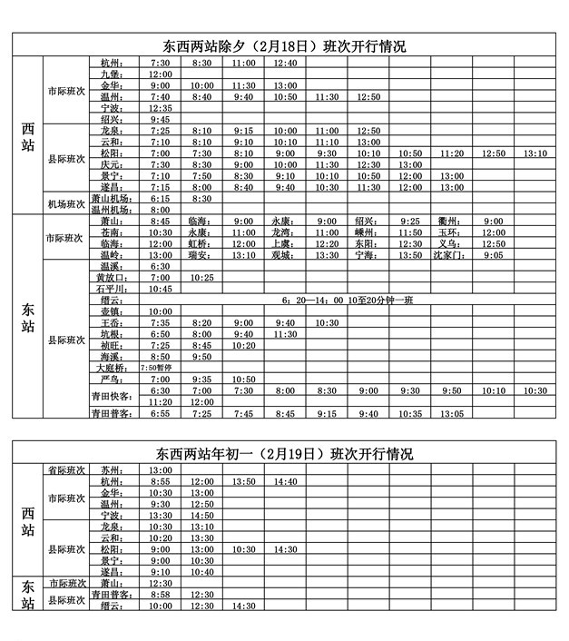 根據(jù)今年春運(yùn)實(shí)際的情況,東、西兩站對(duì)春節(jié)期間的客運(yùn)班車(chē)作出調(diào)整。2月18日(除夕)、19日(大年初一)的客運(yùn)班次變動(dòng)較大,密集減少,省際班次基本上停班。特別提醒要在除夕和正月初一這兩天下午出門(mén)的乘客,由于部分客車(chē)班次已經(jīng)停班,請(qǐng)?zhí)崆瓣P(guān)注班次安排,或撥打電信114詢(xún)問(wèn) ,盡量提前購(gòu)票以免耽誤您的行程。從2月20日(初二)起客車(chē)班次逐漸恢復(fù),2月22日(初四)起全部恢復(fù)正常發(fā)班。