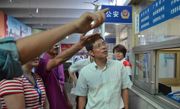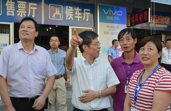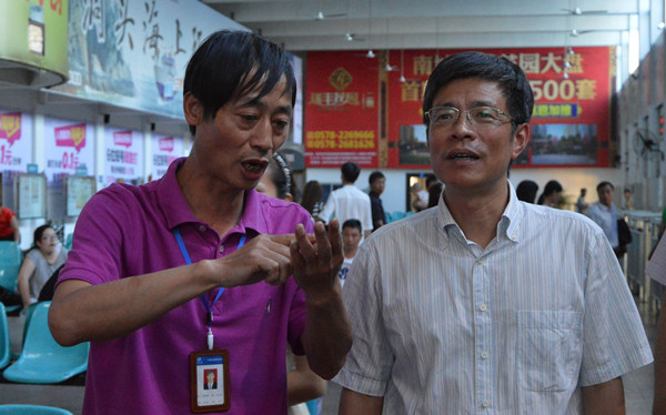 在客運西站,陳部長一行察看了售票大廳、候車室前廳等地方??吹绞燮贝髲d內(nèi)文明旅游引導(dǎo)員正在引導(dǎo)旅客有序排隊購票,文明旅游公益宣傳提示牌擺放整齊,兩處文明旅游標(biāo)語均按規(guī)定陳列醒目時,陳部長對西站的工作也給予了充分肯定。在進(jìn)一步了解情況后,陳部長對身邊的運管部門負(fù)責(zé)人說:“西站的問題不在站內(nèi),主要在出租車管理和黑車的打擊,運管部門要做好管理工作。”隨后與各部門負(fù)責(zé)人一起商議了出站口出租車管理措施、硬件改造等問題。