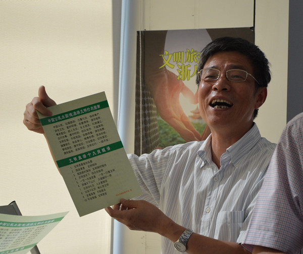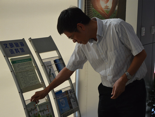 陳建波部長仔細(xì)翻看文明旅游宣傳材料