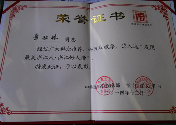 “發(fā)現(xiàn)最美浙江人--浙江好人榜”推薦評(píng)選活動(dòng)由省委宣傳部、省文明辦聯(lián)合開(kāi)展,每月推薦評(píng)選一次,旨在為大力培育和弘揚(yáng)社會(huì)主義核心價(jià)值觀,積極普及和踐行當(dāng)代浙江人共同價(jià)值觀,進(jìn)一步深化“發(fā)現(xiàn)‘最美浙江人’、爭(zhēng)做‘最美浙江人’”主題宣傳實(shí)踐活動(dòng),健全和完善“浙江好人”選樹(shù)和培育機(jī)制,推動(dòng)“最美”從“盆景”變成“風(fēng)景”、從“風(fēng)景”變?yōu)椤帮L(fēng)尚”。推薦評(píng)選分為助人為樂(lè)類(lèi)、見(jiàn)義勇為類(lèi)、誠(chéng)實(shí)守信類(lèi)、敬業(yè)奉獻(xiàn)類(lèi)和孝老愛(ài)親類(lèi)五個(gè)類(lèi)別。評(píng)選活動(dòng)經(jīng)過(guò)網(wǎng)絡(luò)投票、群眾評(píng)議、專(zhuān)家評(píng)審等環(huán)節(jié),12月份共評(píng)選出25名浙江好人,章雙林入選見(jiàn)義勇為類(lèi)浙江好人。