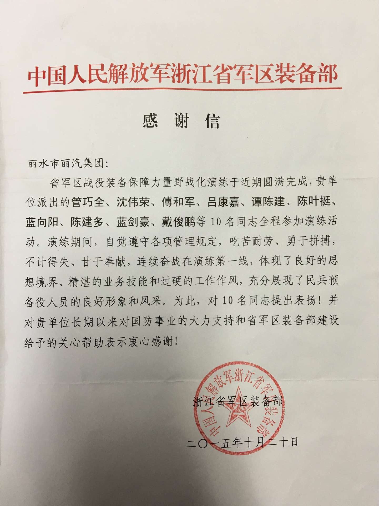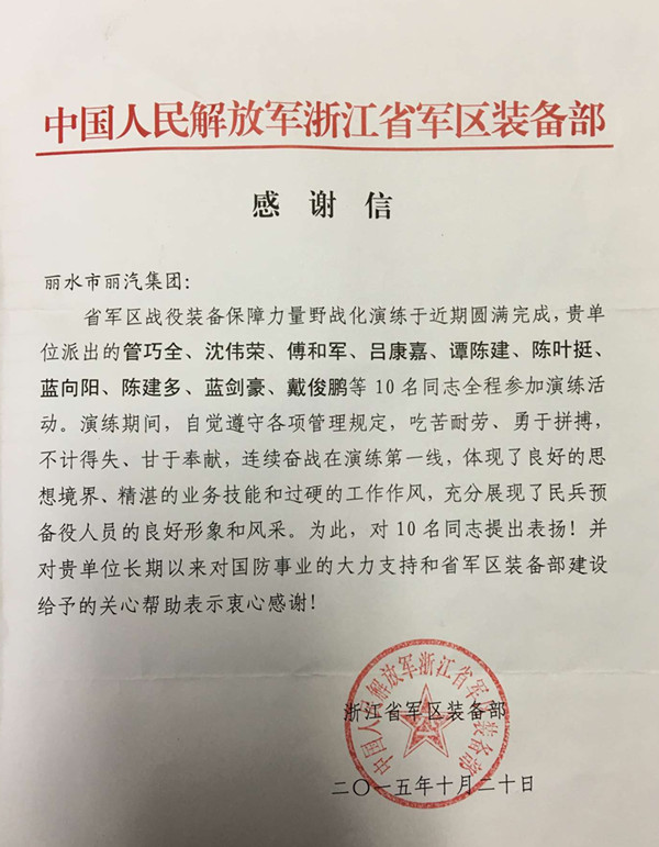 11月19日,麗汽集團(tuán)收到浙江省軍區(qū)裝備部的一封感謝信。信中對(duì)來(lái)自快客、伊翔、長(zhǎng)運(yùn)、甌龍等公司的修理工予以了表?yè)P(yáng),充分肯定了麗汽員工在參加省軍區(qū)裝備部組織的戰(zhàn)役裝備保障力量野戰(zhàn)化演練中的優(yōu)異表現(xiàn)。