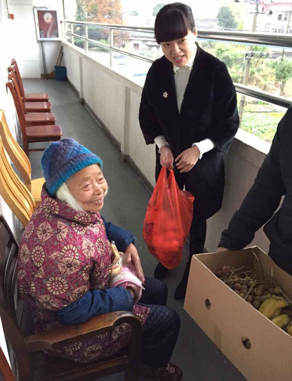 經(jīng)過20多分鐘的車程,下午3點(diǎn),我們的車子到達(dá)了靈山敬老院,因為事先聯(lián)系,已經(jīng)有許多老人在門口等候我們。與在場的老人一一問候后,我們十余名團(tuán)員迅速分工,將帶來的水果和餅干等點(diǎn)心給不同樓層的老人送上,并帶上大家的祝福。我們的到來,使原本安靜的敬老院變得熱鬧,歡笑聲此起彼伏,我們陪著老人聊天,給他們送上熱騰騰的開水,將順手剝好的水果遞上。