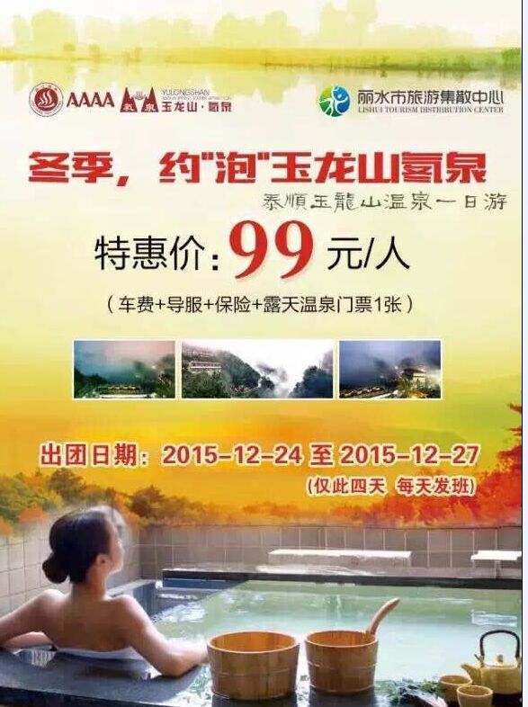 “溫州泰順玉龍山氡泉99元一日游”是集散中心即將在12月24-27日期間推出的一款特惠旅游產(chǎn)品,即在12月24日至27日期間,集散中心全天接受和發(fā)送前往溫州泰順玉龍山氡泉一日游,團(tuán)費(fèi)99元/人(包括車費(fèi)、門票、導(dǎo)服費(fèi)和保險(xiǎn)費(fèi))。與平時(shí)的每人238元的團(tuán)費(fèi)相比,參加集散中心的特惠游,每人可以節(jié)省139元。