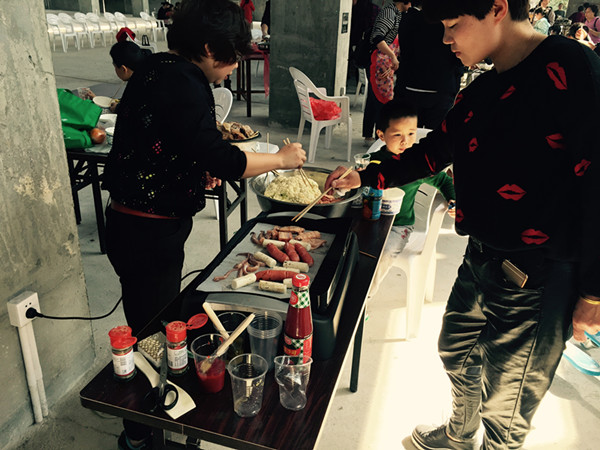 包水餃日常在家我們也經(jīng)常做,可是自己揉面搟餃子皮對(duì)于很多人來(lái)說(shuō)還是第一次。還好我們組有幾個(gè)經(jīng)驗(yàn)的姐姐,在她們的指導(dǎo)下大家分工合做,有的揉面有的搟餃子皮有的負(fù)責(zé)包。由于我們當(dāng)中還有很多是初學(xué)者,搟出來(lái)的餃子皮大小厚度各有不同,包的餃子更是融入了南北方不同手法,最后包出來(lái)的餃子形狀各異,色彩斑斕。但是自己的勞動(dòng)成果味道總是特別的好。這邊包餃子的同事們正包的起勁,那邊燒烤的同事也沒閑著不停為我們送上他們烤的烤串品嘗。燒烤的時(shí)候也是小插曲不斷,由于功率過大先是把同事家里帶來(lái)的插座燒了,后來(lái)又跳閘沒電,所幸都一一解決了,我們才能吃上色香味俱全的燒串。