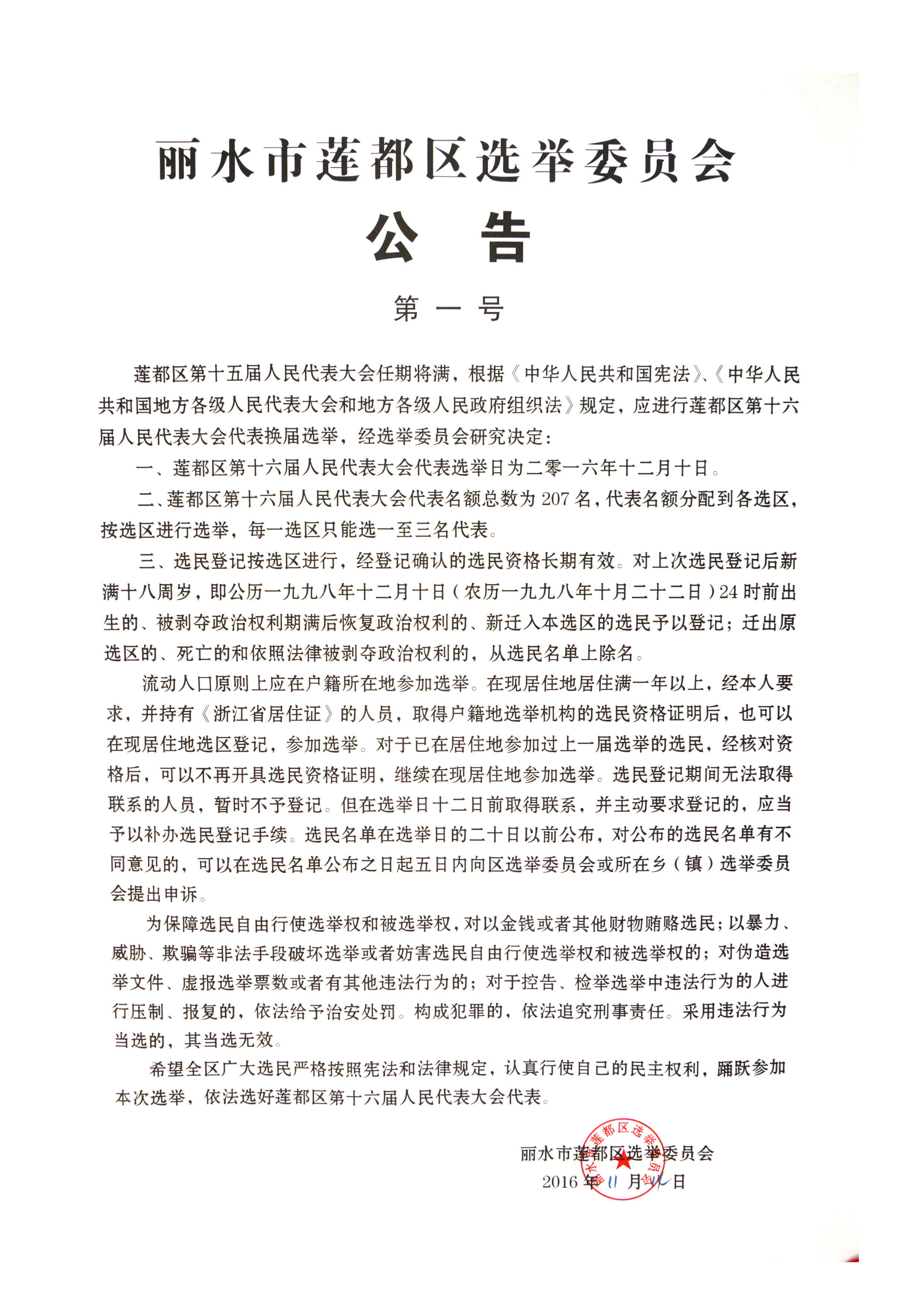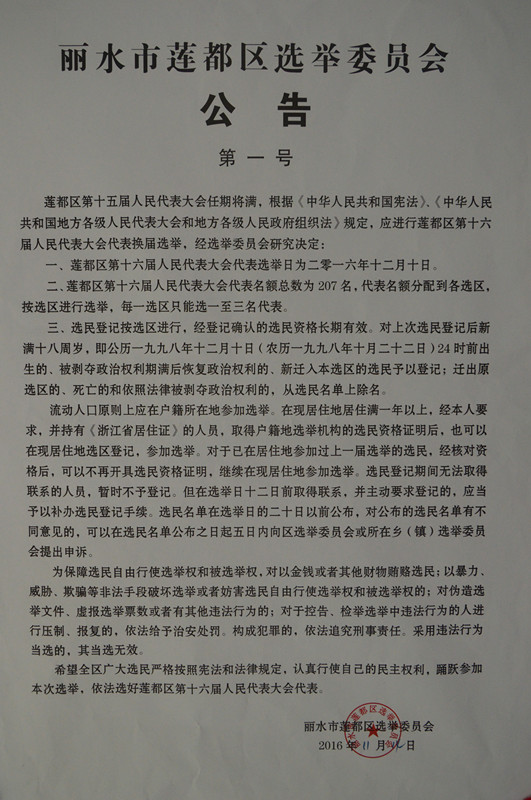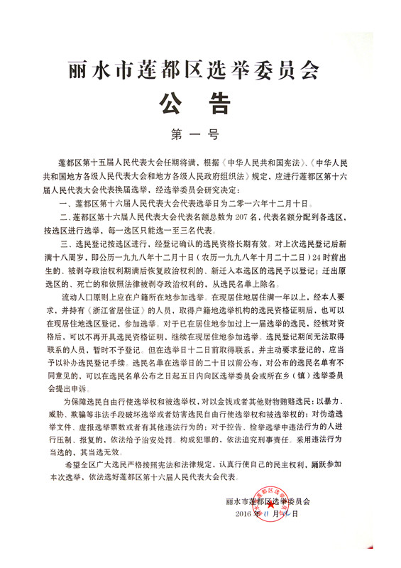 麗水市蓮都區(qū)選舉委員會公告(第一號)