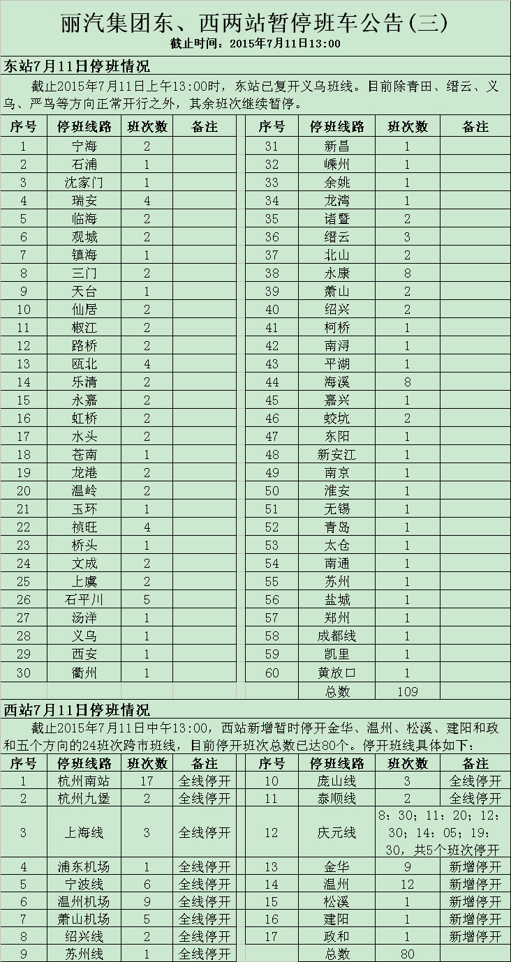 截止7月11日13:00,麗汽集團(tuán)東、西兩站班車停復(fù)班情況: