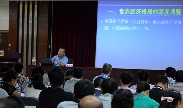 在上課過程中,陳敬東教授圍繞世界經(jīng)濟(jì)格局的深度調(diào)整、中國經(jīng)濟(jì)的換檔期和陣痛期、大膽創(chuàng)新落實改革意圖、中國經(jīng)濟(jì)的發(fā)展趨勢分析及新形勢下企業(yè)如何應(yīng)對挑戰(zhàn)等五個方面對當(dāng)前宏觀經(jīng)濟(jì)形勢進(jìn)行了分析講解。在企業(yè)如何應(yīng)挑戰(zhàn)中,陳教授指出:在當(dāng)前形勢下,企業(yè)應(yīng)從培育新的意識、找準(zhǔn)新的定位、制定新的戰(zhàn)略、開發(fā)新的產(chǎn)品和服務(wù)、建立新的品牌等方面進(jìn)行努力,迎接新一輪挑戰(zhàn)。