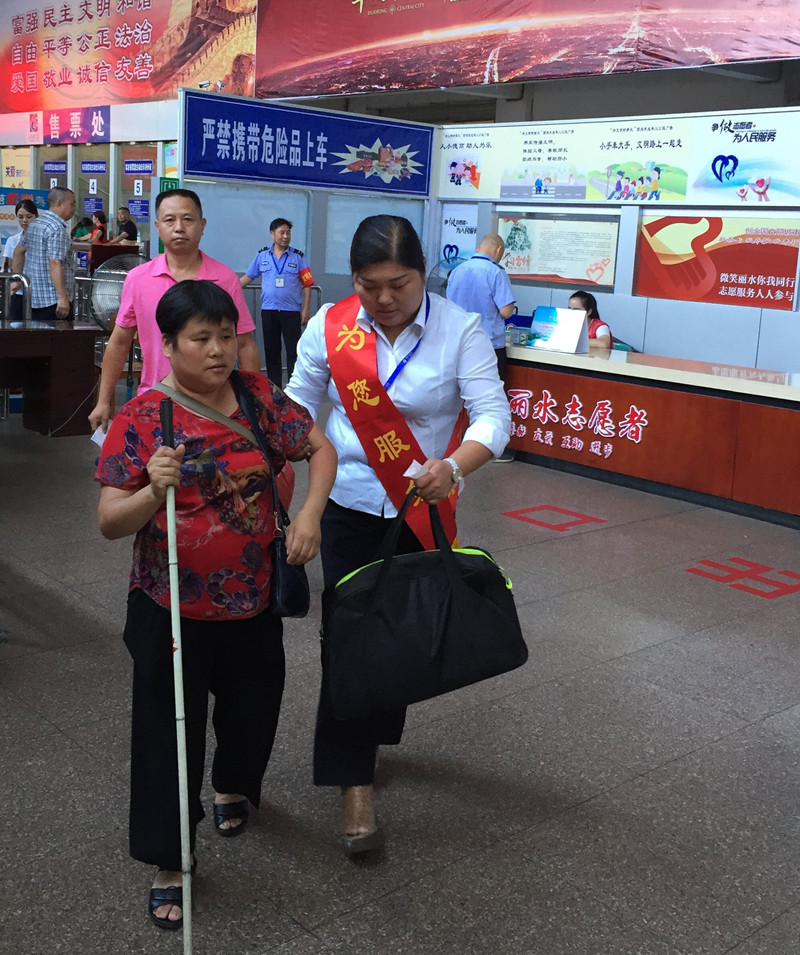 大姐的眼睛因為一年前得了疾病導致看不見,今天到東站準備坐車去縉云。當時正在售票廳引導一米線的毛麗珍看到了正慢慢摸索、一步步小心翼翼往前走的大姐。她趕緊上前扶著大姐并幫她購買了去縉云的車票,看她行走不方便,毛麗珍就一路扶著她,并一直送她到車上。別看毛麗珍人長得大個,可她的心卻細著,哪里需要轉彎,哪里有臺階,哪里需要注意的,她都一一耐心的提醒大姐小心注意。