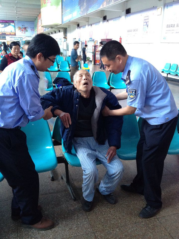 見此情況,吳麗君立即通知了駐站派出所。檢票員施筆婷經(jīng)過此處,得知情況后急忙向當(dāng)班值班站長匯報,一邊撥打了120。聞訊趕來的派出所民警張冰等人將老人扶出衛(wèi)生間。隨后120趕到,東站工作人員協(xié)助120將老人抬上救護(hù)車,送往麗水中醫(yī)院救治。為能盡快聯(lián)系上老人的家人,民警檢查了老人的隨身物品,可是沒找到任何有用的信息。目前,有關(guān)方面正積極努力通過其他途徑查找老人的親屬。