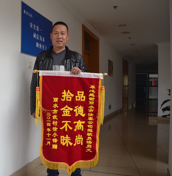 “拾金不昧,本不是新聞了,但輪到自己親身體驗這種社會正能量的日益增長,還是讓我倍感欣喜?!?0月16日傍晚,在江蘇開超市的徐先生手拿錦旗,來到快客分公司車隊,對駕駛員湯勇文拾金不昧的精神予以表揚。他說,11月14日他乘坐18:45從杭州回麗水的班車,一時大意把隨身的錢包遺失了,里面有五千多元的現(xiàn)金和若干張銀行卡。次日,當他焦急萬分來到快客車隊時,卻發(fā)現(xiàn)駕駛員湯勇文正拿著妥善保管的皮夾等著他。